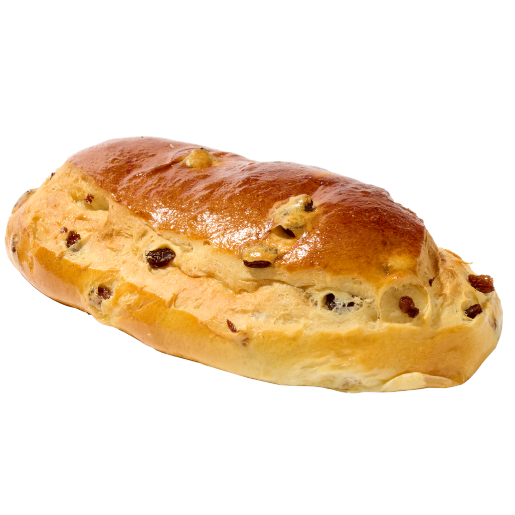 Farine, lait, beurre, œufs, sucre, levure, sel, raisins secs