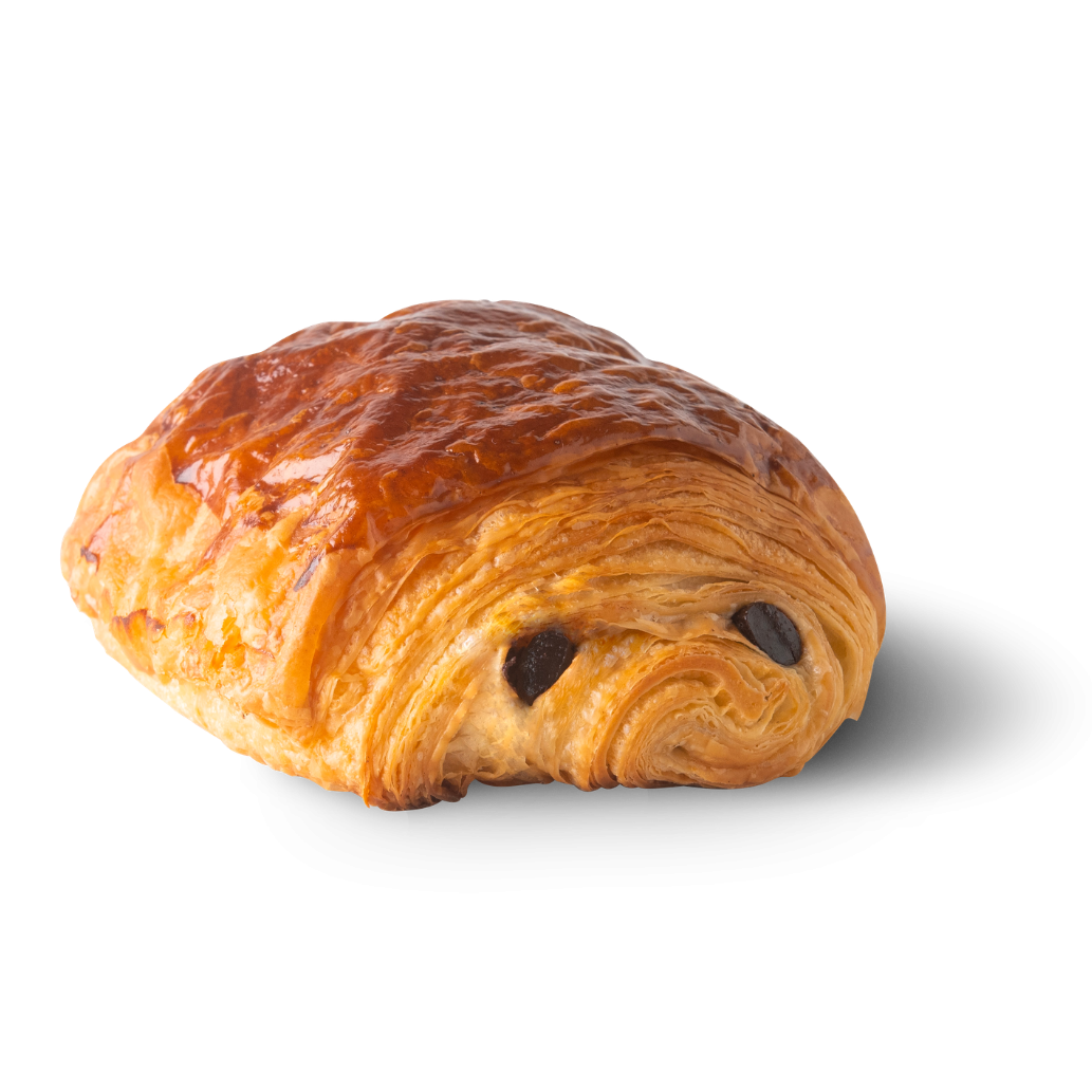 Onze chocoladebroodjes worden gemaakt van bladerdeeg met boter. Tussen het bladerdeeg leggen we twee staafjes chocolade van de hoogste kwaliteit, voor chocoladebroodjes om duimen en vingers bij af te likken.