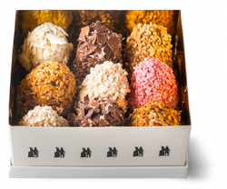 MiniMeringue, praline whipped cream, coated with crushed caramelized almonds and hazelnuts.